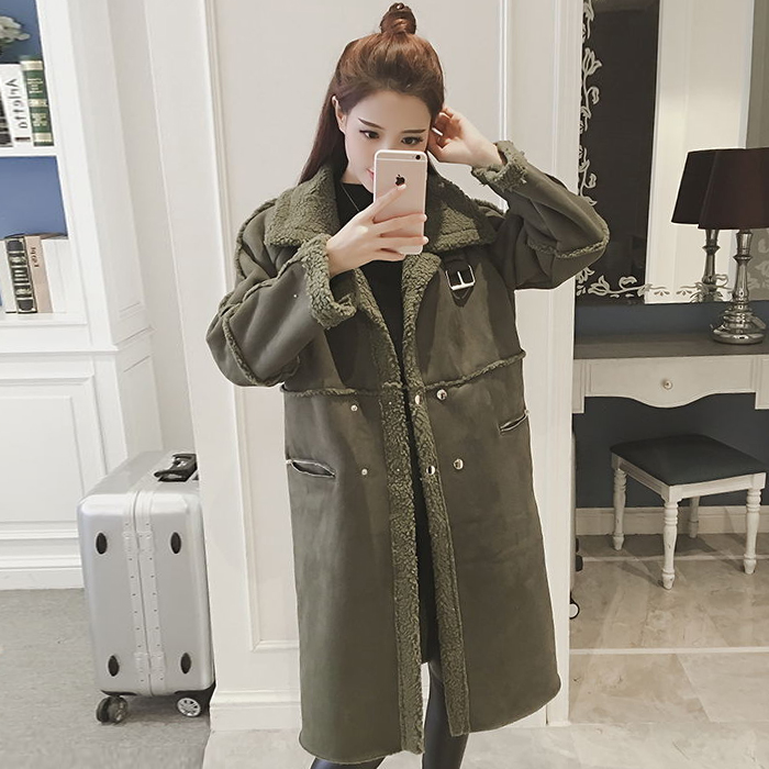 / 秋冬新款韓版時尚翻領長袖加絨大衣女裝寬松顯瘦中長款鹿皮絨外套