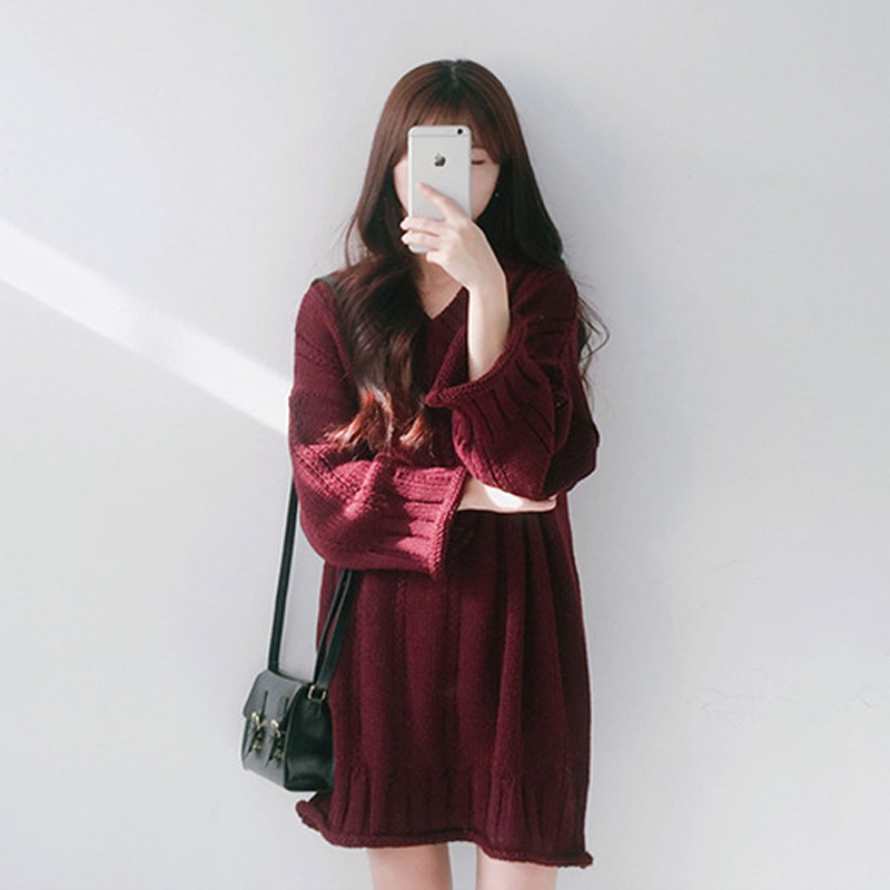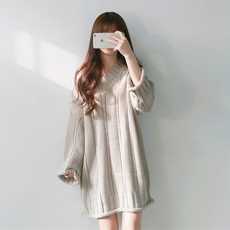 / 韓版秋冬季加厚v領粗毛線寬松大碼中長款連衣裙毛衣女套頭針織衫