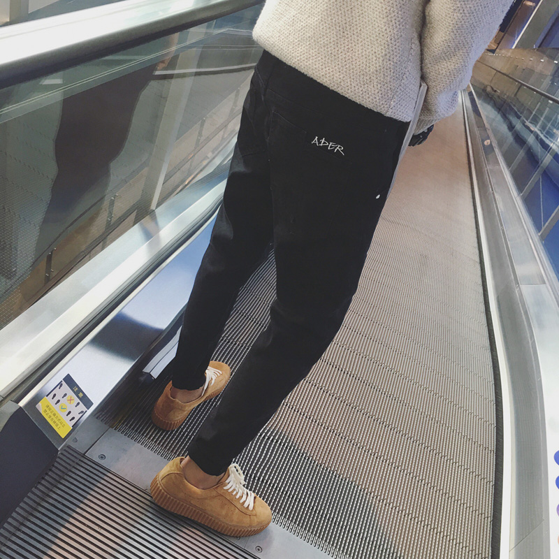 秋冬新品韓版字母刺繡休男士修身水洗小腳牛仔褲